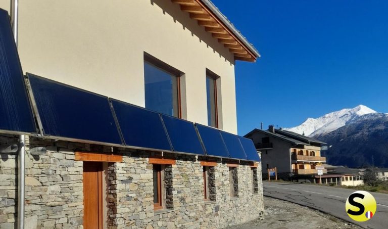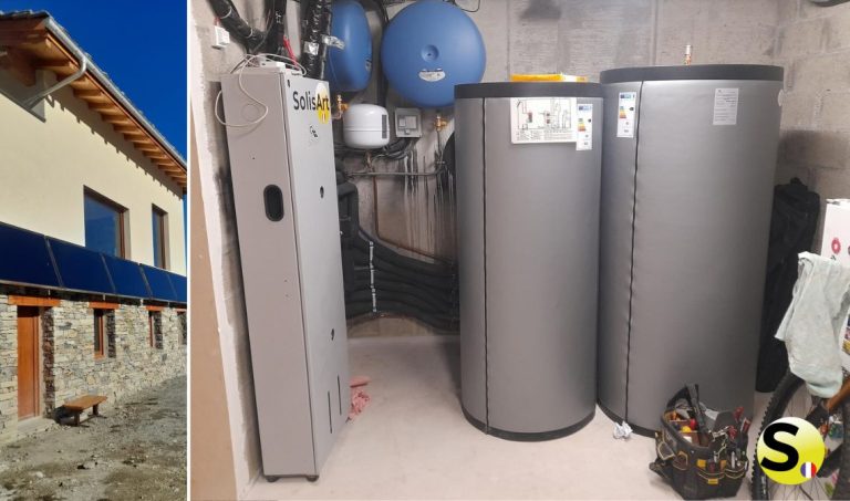 Dans le cadre d’un logement neuf à Aussois (73500), Arnaud Energie a installé un système de chauffage solaire thermique SolisArt SC2. 15 m² de capteurs posés à l’horizontale alimentent un ballon ECS de 500 L et un ballon tampon de 500 L. L’installation comprend la pose d’une armoire hydraulique SC2 et est couplée à un poêle bouilleur granulés. La présence importante de solaire passif sur la maison rend le ballon tampon particulièrement utile pour optimiser les apports solaires.